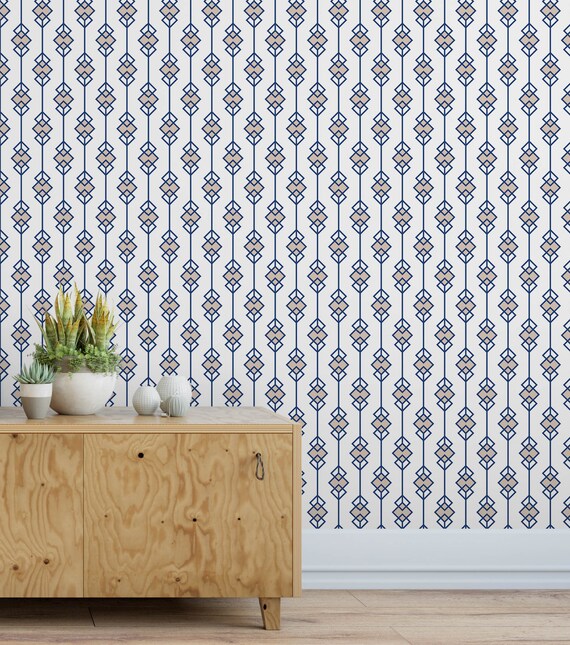 Geometric Art Deco Interlocking Diamonds Self Adhesive Removable Wallpaper Retro Style Navy Blue Peel And Stick Application For Walls Cc136