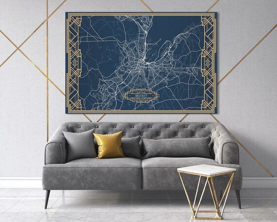 Belfast Northern Ireland Map Art Deco Large Horizontal Map Stretched Canvas Wall Art Canvas Print Ready To Hang Gallery Art Deco Map Style
