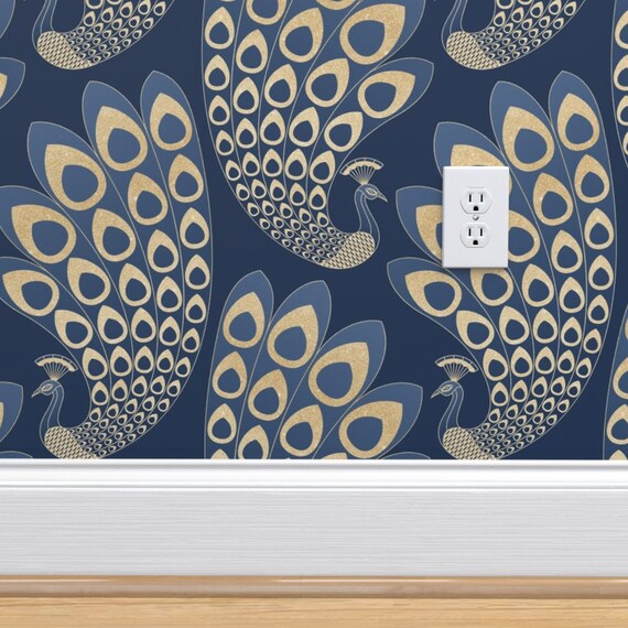Art Deco Wallpaper Blue And Gold Art Deco Peacock By Marketa Stengl Custom Printed Removable Self Adhesive Wallpaper Roll By Spoonflower